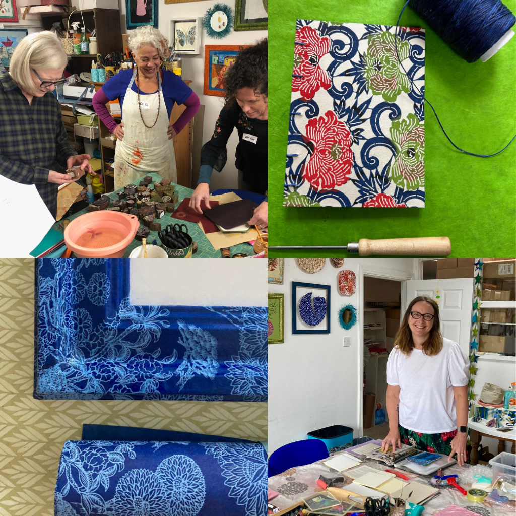 The image shows clockwise from top left. Beta's Block Printing, Gretchen's Coptic Stitch, Sinead Lawson has 3 different Gelli art classes and Sheila's Frame Upcycling.